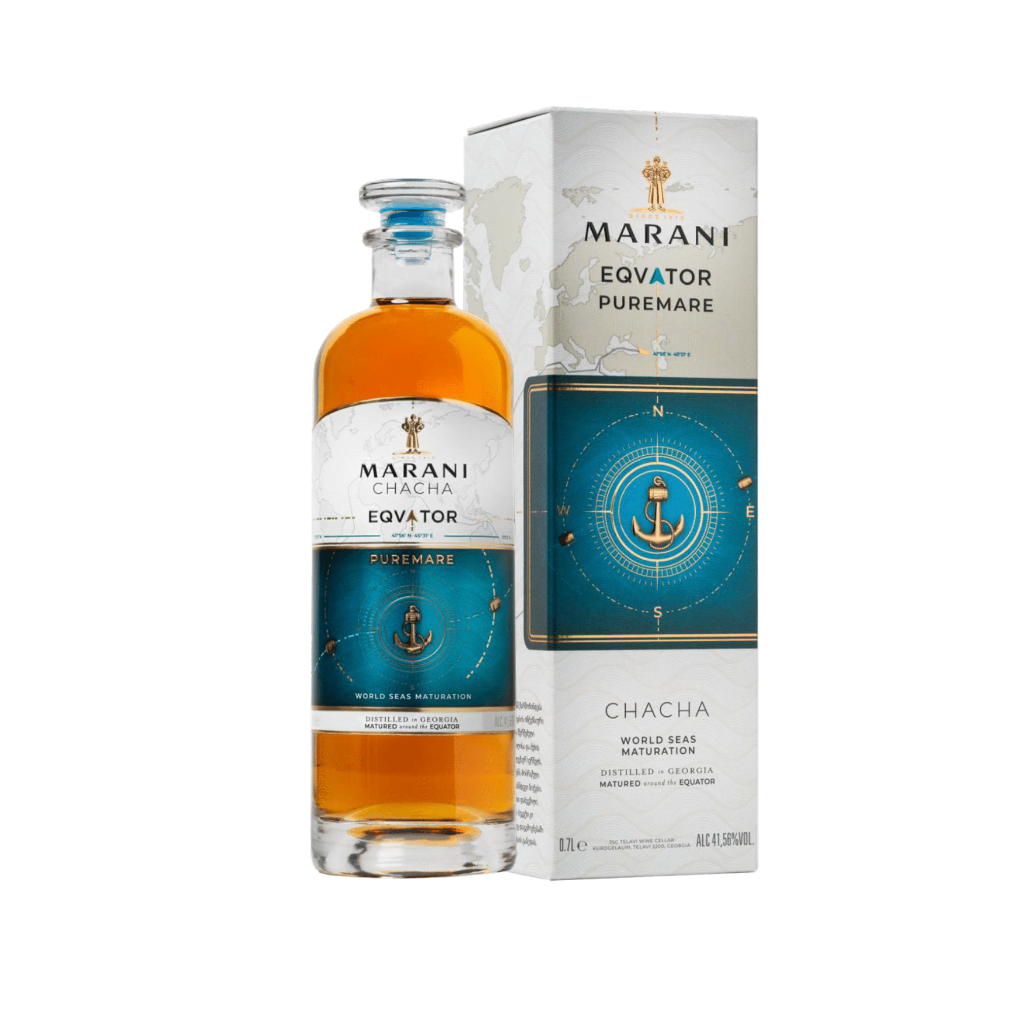 Po powrocie z podróży dookoła świata Marani Chacha została starannie „dopracowana” w chłodnych wnętrzach naszej podziemnej piwnicy. Ostateczna kompozycja powstała dzięki precyzyjnemu połączeniu z wodą źródlaną, czego efektem jest MARANI CHACHA EQVATOR PUREMARE.